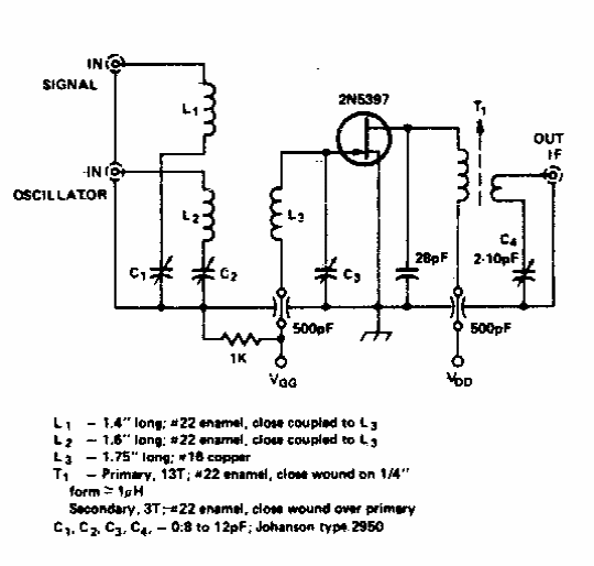 Este circuito foi encontrado numa documentação dos anos 70. O FET admite equivalentes atuais e a frequência dos sinais depende das bobinas empregadas.