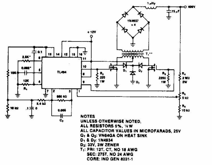 Encontrado numa documentação dos anos 80, este circuito de conversor ou inversor usa componentes da época, operando numa frequência de 100 kHz.