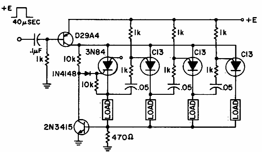Este circuito, que aparece em outras versões neste site, foi obtido em documentação antiga. A carga de cada PUT depende de suas características. O circuito é de baixa frequência.