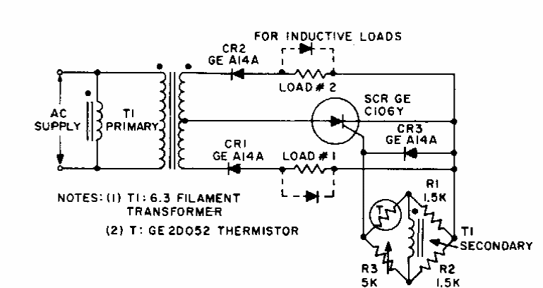 Este circuito com duas saídas foi encontrado numa documentação da General Electric dos anos 90. O circuito usa um NTC como sensor e o elemento de controle é um SCR.