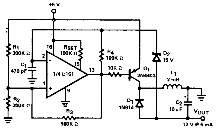 Este pequeno inversor de baixa corrente opera numa frequência de 20 kHz. Encontramos numa documentação dos anos 80. O circuito integrado é da época.