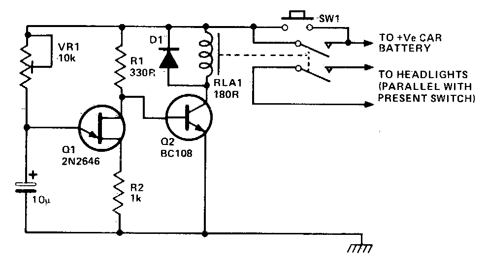 Encontrado numa documentação americana dos anos 90, este circuito mantém o farol alto acionado por um tempo determinado pelo ajuste do trimpot. O relé é de 12 V sensível.