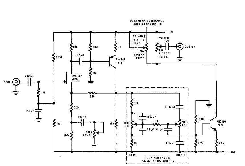 Encontrado em documentação da National Semionductor este circuito reúne um controle de tom a um preamplificador de excelente desempenho. Os componentes são da década de 90, mas podem ser usados equivalentes modernos.