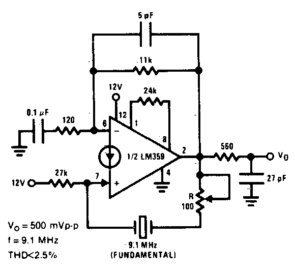 Este oscilador de 5,1 MHz foi encontrado numa documentação americana dos anos 80. O operacional utilizado é de tipo pouco comum em nossos dias. A alimentação não precisa ser simétrica.