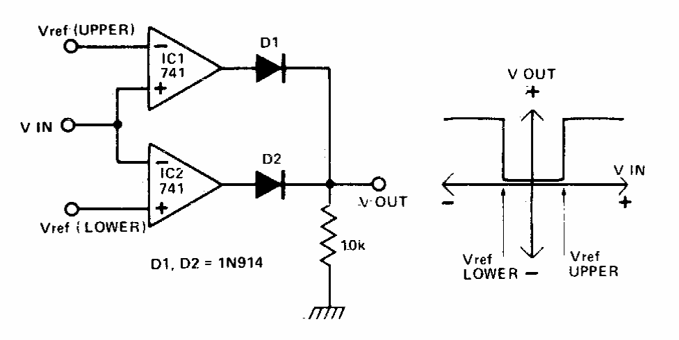 Esta é a configuração tradicional de um comparador de janela usando amplificadores operacionais como o 741. O circuito é de uma documentação dos anos 90. As tensões de referência podem ser geradas por divisores resistivos.