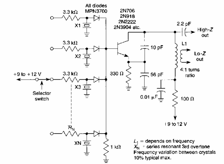 Este circuito pode gerar sinais de diversas frequências, comutado por uma tensão DC. As frequências são determinadas pelos cristais. O circuito é de uma documentação americana dos anos 90.