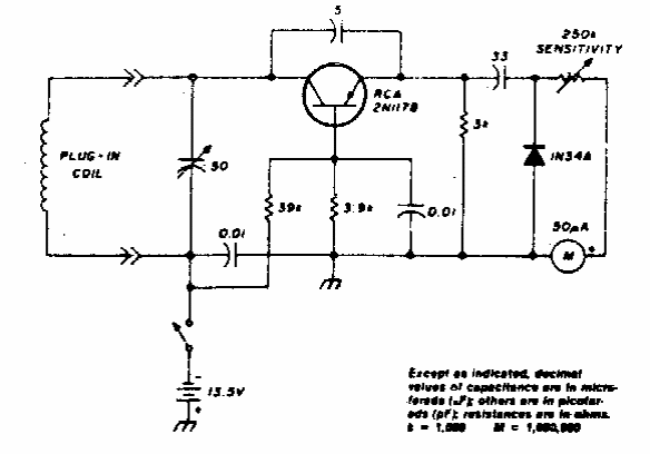 Este circuito foi obtido numa publicação americana dos anos 80. O circuito usa um transistor a época, mas equivalentes de RF modernos podem ser usados. A faixa de frequências depende da bobina.