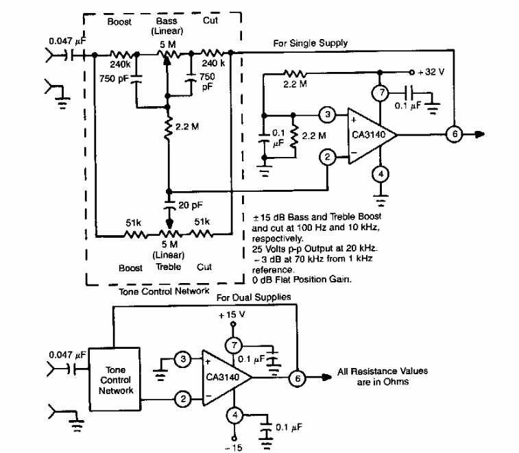 Encontrado numa documentação da RCA dos anos 90, este controle de graves e agudos usa um operacional da época que ainda pode ser encontrado em nossos dias.
