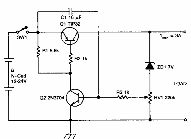 Este circuito para descarga de baterias NiCad limita a corrente a um valor que pode ser ajustado no trimpot. O circuito é para baterias de 12 a 24 V.