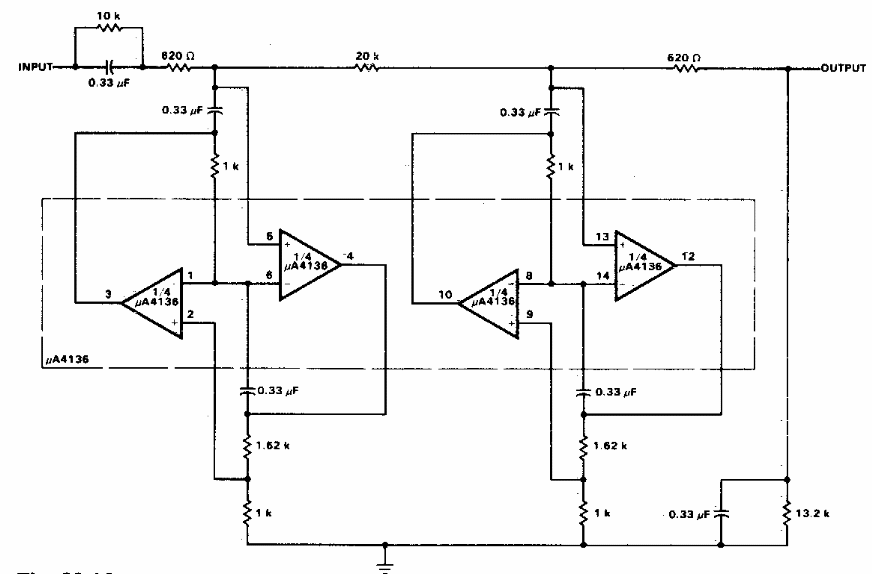 Este filtro ativo Butterwoth foi encontrado numa documentação dos anos 90. Ele pode ser elaborado com base em amplificadores operacionais modernos. A fonte deve ser de acordo com os operacionais usados.