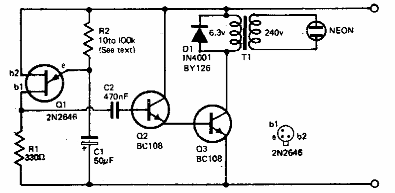 Este circuito transistorizado é alimentado por uma tensão de 6 a 12 V fornecendo alta tensão para uma lâmpada neon. O circuito é de uma publicação dos anos 90. Transistores equivalentes modernos podem ser usados.