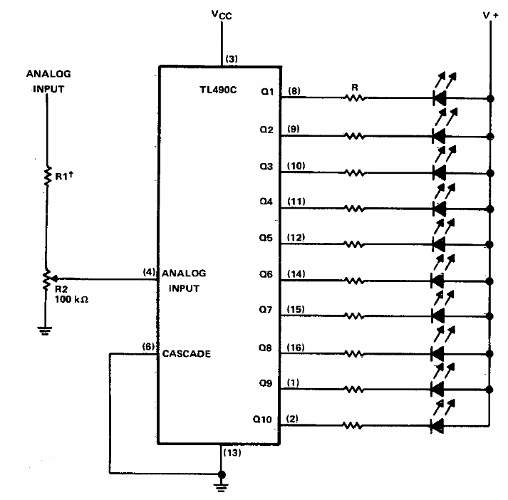 Encontrado numa documentação dos anos 90, este circuito faz uso de apenas um circuito integrado. Os resistores em série com os LEDs dependem da alimentação que pode ficar entre 5 e 12 V.