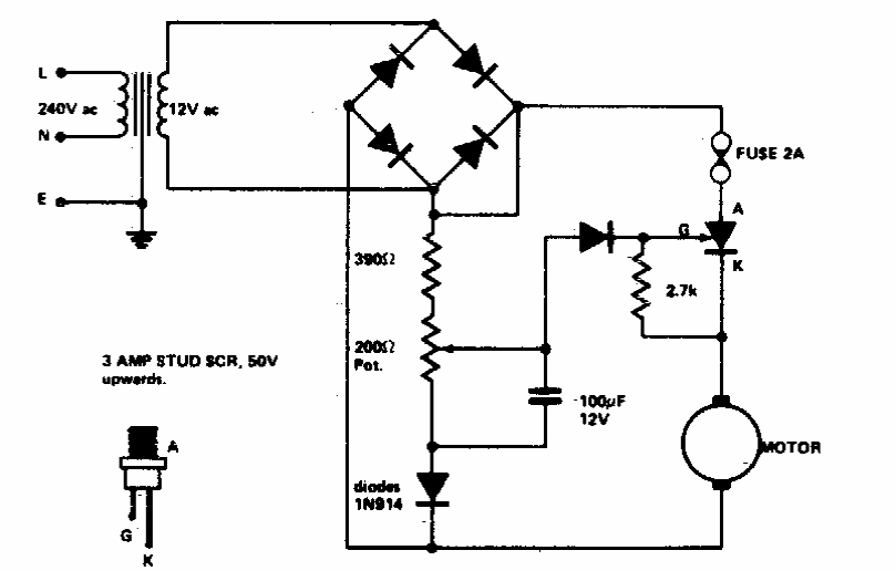 Encontrado numa documentação antiga, este circuito usa um SCR como o TIC106 que deve ser dotado de um dissipador de calor. O motor pode ter até 3A de corrente.