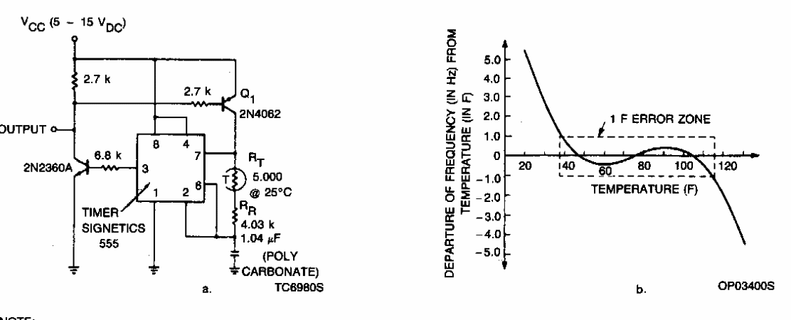 Este circuito foi encontrado em documentação da Signetics dos anos 90. A curva de desempenho do circuito é mostrada ao lado do diagrama. O sensor é um NTC.