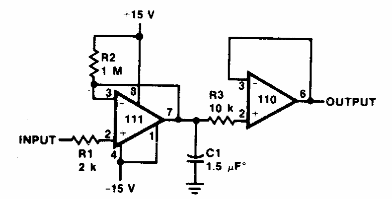 No diagrama temos o modo de se fazer a detecção de picos negativos de um sinal. O circuito é dos anos 80, usando amplificadores operacionais a época. No entanto, a configuração pode ser elaborada com componentes equivalentes modernos.