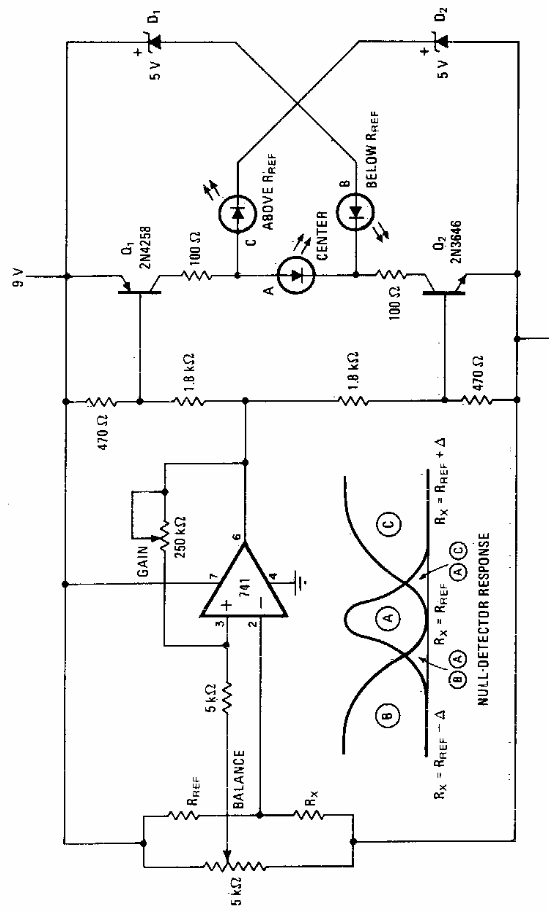 Usando comparadores, este circuito pode ser utilizado numa ponte de medidas. A indicação de equilíbrio é feita através de LEDs. Encontramos o circuito numa antiga documentação americana.