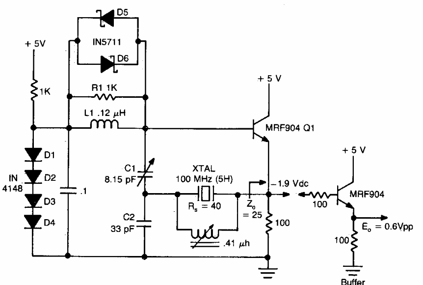 Este oscilador com seguidor de emissor foi encontrado numa documentação americana dos anos 80. O circuito gera sinais de 100 MHz e os transistores admitem equivalentes modernos.