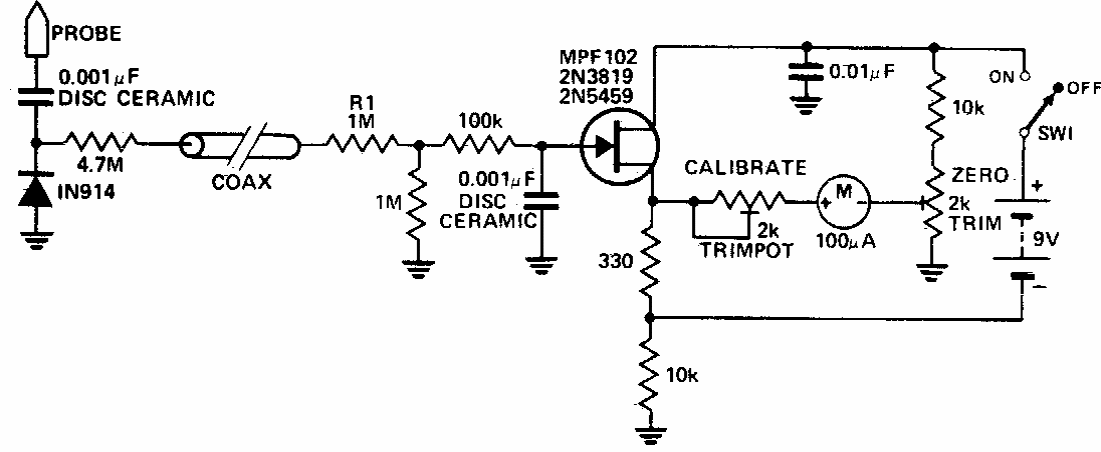 Este circuito para medidas de RF até 200 MHz foi encontrado numa documentação dos anos 80. A sensibilidade é de 1V de pico e os componentes usados ainda são comuns em nossos dias.