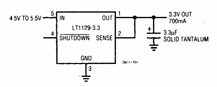 Este circuito para circuitos lógicos de 3,3 V tem entrada de 5 V e a corrente máxima de saída é da ordem de 1 A. O circuito é de um manual da Linear Technology.