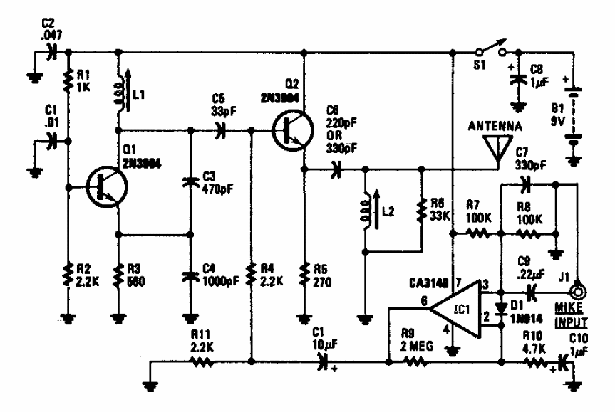 Este pequeno transmissor AM foi encontrado numa documentação americana dos anos 80. Os transistores admitem equivalentes, assim como o amplificador operacional. O circuito opera entre 800 kHz e 1600 kHz. L1 pode ter de 80 a 100 espiras de fio 26 ou 28 num bastão de ferrite.