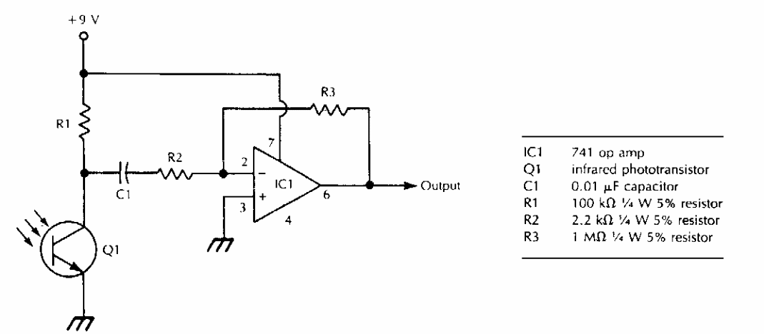 Encontrado numa documentação americana dos anos 90, este circuito recebe sinais infravermelhos modulados. A taxa de transmissão depende do operacional usado. A aplicação principal é como link de áudio.