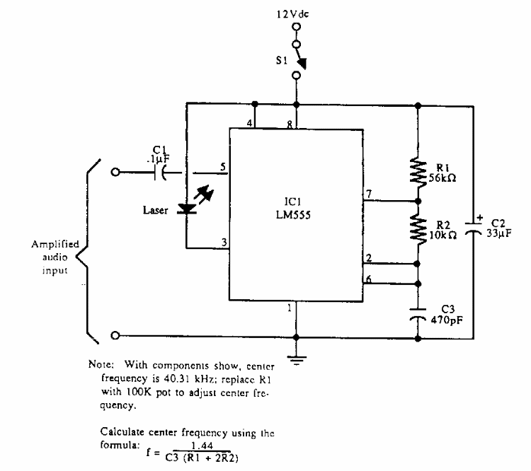 Este circuito modulador foi encontrado numa documentação americana dos anos 90. O circuito usa um diodo LASER de baixa potência. A alimentação é feita com 12 V.