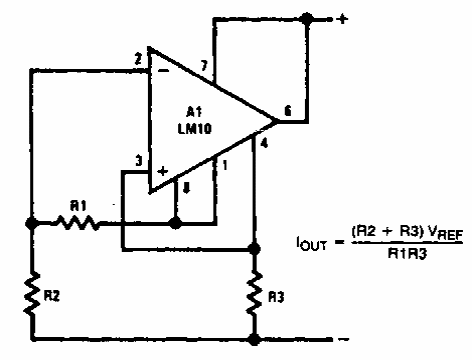 Esta é a configuração básica de um amplificador operacional como regulador de corrente. Encontramos num manual da National Semiconductor dos anos 90. Vale para outros operacionais.