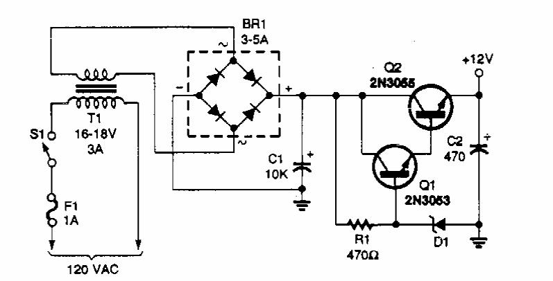 Esta fonte simples de 12 V com corrente até 2 A foi encontrada numa Popular Electronics dos anos 90. O diodo zener é de 14 V e o transistor Q2 pode ser um TIP42.