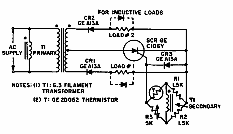 Este circuito foi obtido num manual de SCRs da GE de 1967. Ele se destina ao controle de relés respondendo a diminuição ou elevação da temperatura.