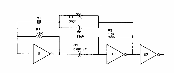Este circuito deve ser alimentado por uma tensão de 5 V. A frequência depende dos componentes usados e do cristal. O circuito vale para inversores CMOS com alterações dos valores dos componentes.