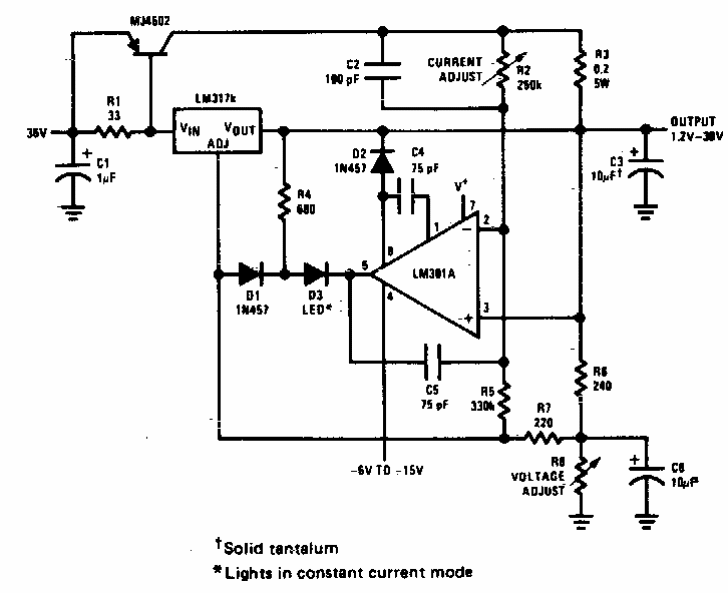 Encontrado em publicação técnica dos anos 80, este circuito utiliza componentes da época. Pode-se tentar modificar o circuito para usar componentes modernos. A corrente máxima é de 5A.