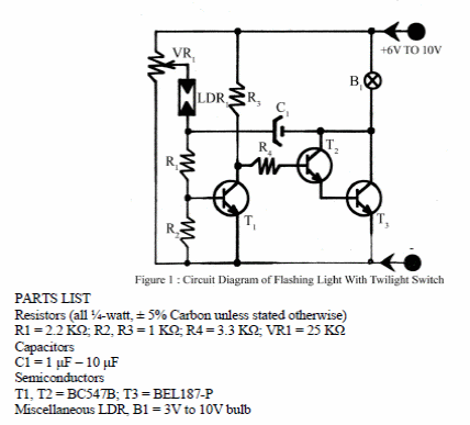 Este simples pisca-pisca para lâmpada incandescente foi obtido numa documentação inglesa. O transistor de potência pode ser um IP31, TIP41 ou 2N3055 conforme a potência da lâmpada.