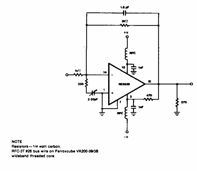 Este amplificador foi encontrado em documentação dos anos 70. O produto ganho x faixa passante é 350 MHz. O circuito integrado é da época, pouco comum atualmente.
