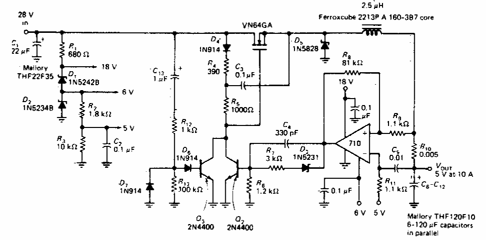 Esta fonte chaveada foi encontrada numa documentação dos anos 70. Os componentes básicos são da época. O circuito opera em 200 kHz e tem um ripple menor que 200 mV.