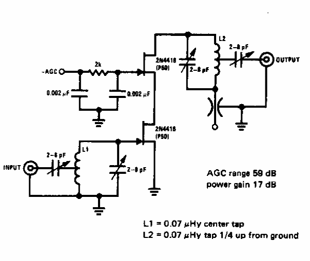 Encontramos este amplificador de RF numa documentação dos anos 70. Os transistores de efeito de campo admitem equivalentes modernos. O circuito é crítico.