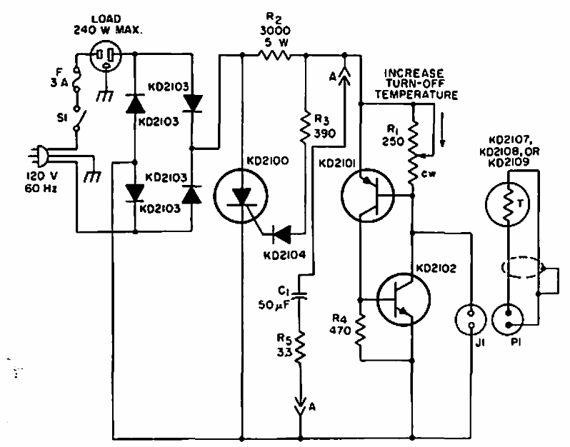 Este circuito para potências até 240 W foi encontrado num manual de SCRs da RCA de 1967. O SCR deve ser de acordo com a carga controlada.