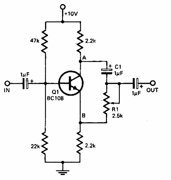 Este circuito desloca a fase de sinais de 600 Hz a 4 kHz. O transistor pode ser o equivalente moderno BC548. O circuito atua na faixa de 0 a 170º tipicamente.