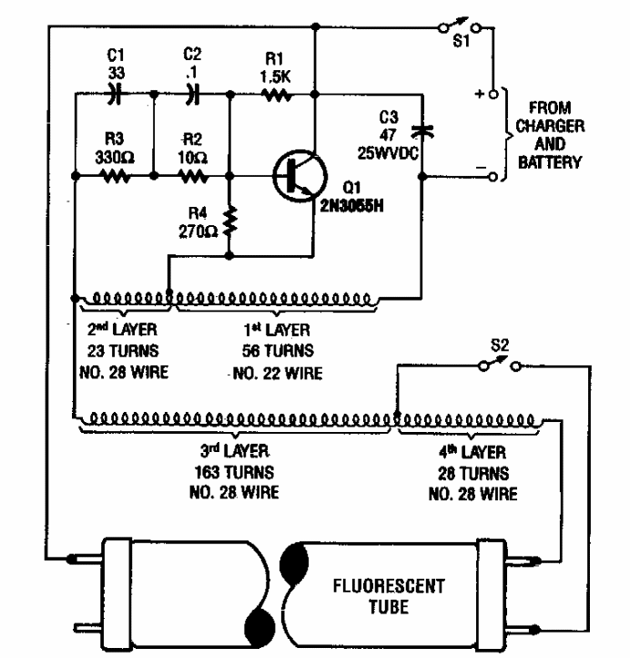 Este circuito, com entrada de 12 V, foi encontrado numa Popular Electronics dos anos 90. São dadas informações sobre o transformador enrolado em ferrite. O transistor deve ser montado em dissipador de calor.
