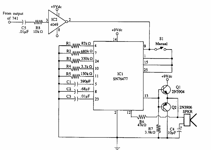 Encontrado numa documentação dos anos 90, ele usa um circuito integrado de efeitos sonoros, o SN7677 da Texas Instruments. Componente pouco comum atualmente.