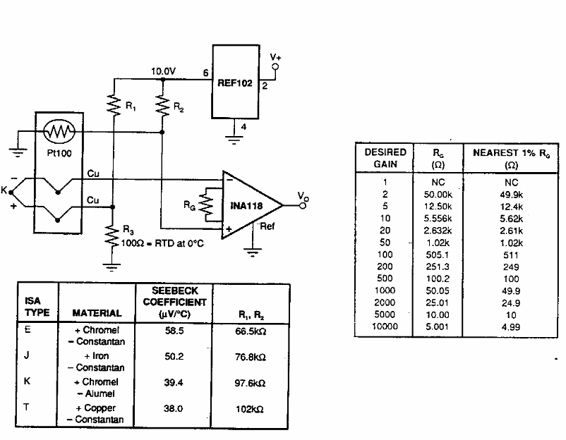 Encontrado numa antiga documentação americana, este circuito usa componentes da Burr Brown. A tabela ao lado fornece os componentes a serem usados para diversos ganhos.