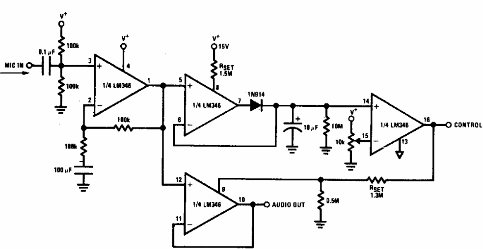 Encontrado numa documentação dos anos 70, este circuito faz uso de amplificadores operacionais da época. Pode ser implementado com componentes equivalentes modernos.