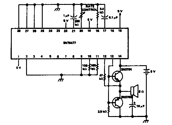 Este circuito de efeitos sonoros de sirene, arma espacial e outros foi encontrado numa documentação dos anos 70. O circuito integrado utilizado é da época, contendo sons e efeitos gravados. Este componente não existe mais em nossos dias.