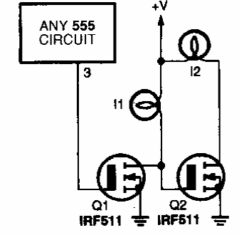 Encontrado numa Popular Electronics dos anos 80, este circuito mostra como acionar duas cargas alternadamente usando um 555. O circuito usa dois MOSFETs de potência para fazer piscar alternadamente duas lâmpadas.