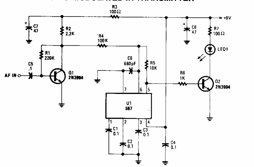 Encontrado numa Popular Electronics dos anos 90, este circuito pode funcionar como um transmissor para um link de áudio. O transistor de saída admite equivalente de maior potência, conforme o LED usado.