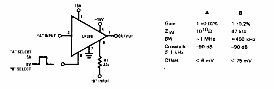 Este circuito pode ser aplicado a amplificadores operacionais equivalentes. Encontramos numa documentação dos anos 80. O circuito deve ser alimentado por fonte simétrica.