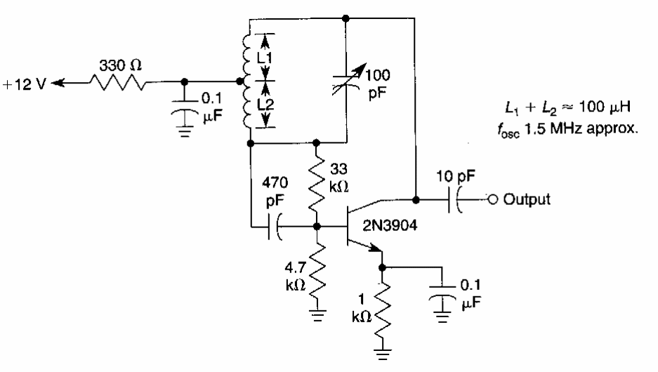 Este circuito foi encontrado numa documentação americana antiga. O transistor é de uso geral e a bobina indicada é para 1,5 MHz. Enrole 50 + 50 espiras de fio 28 num bastão de ferrite para 1 MHz.