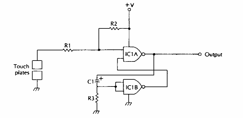 Este circuito temporizador foi encontrado numa documentação antiga. A tecnologia é CMOS. A alimentação pode ser feita com tensões de 3 a 12 V. O tempo depende de R1 e C1.