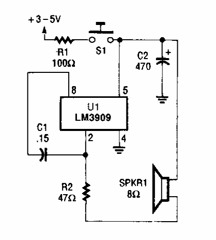 Este circuito com o LM3909 pode ser alimentado com tensões de 3 a 5 V. Encontramos numa Popular Electronics dos anos 90.