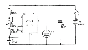 Para encaixar o circuito integrado em teste usamos um soquete DIL de 8 pinos. Observe a posição de encaixe do integrado em prova. Os resistores são de 1/8W ou maiores e o capacitor é de 47 nF. O potenciômetro controla a frequência do som que o transdutor produz. O transdutor pode ser uma cápsula de microfone ou fone de cristal ou cerâmica. A alimentação do circuito pode tanto ser feita com 4 pilhas pequenas como a partir de uma bateria de 9V. Para usar o aparelho, encaixe o circuito integrado em teste no soquete e ligue a alimentação. Ajuste P1 e o transdutor deve emitir um apito se o circuito integrado estiver bom. Ajustando P1 o som muda de frequência.