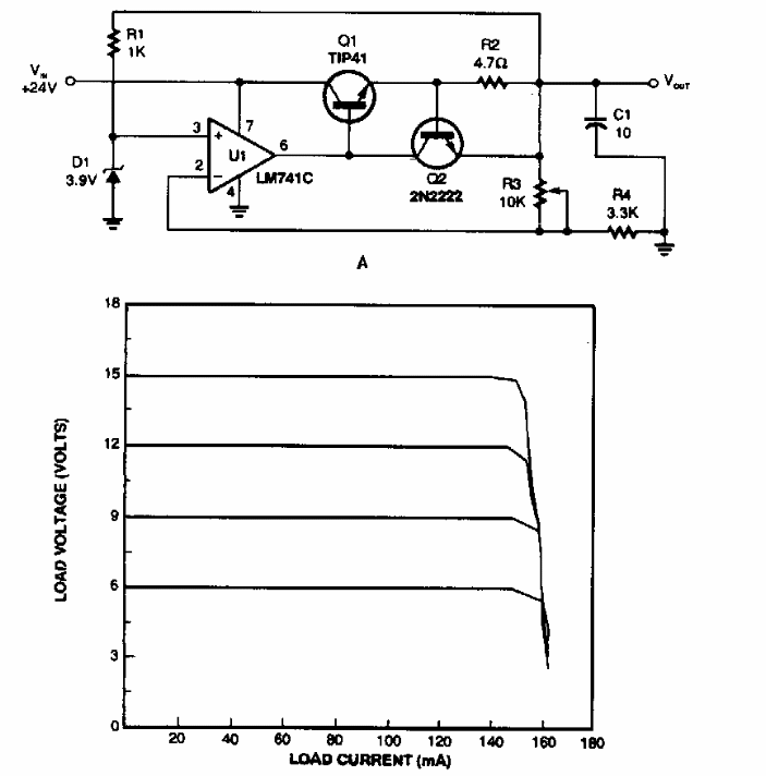 Este circuito foi encontrado numa Popular Electronics dos anos 90. A curva de funcionamento é dada junto ao diagrama. O transistor de potência deve ser dotado de dissipador de calor.